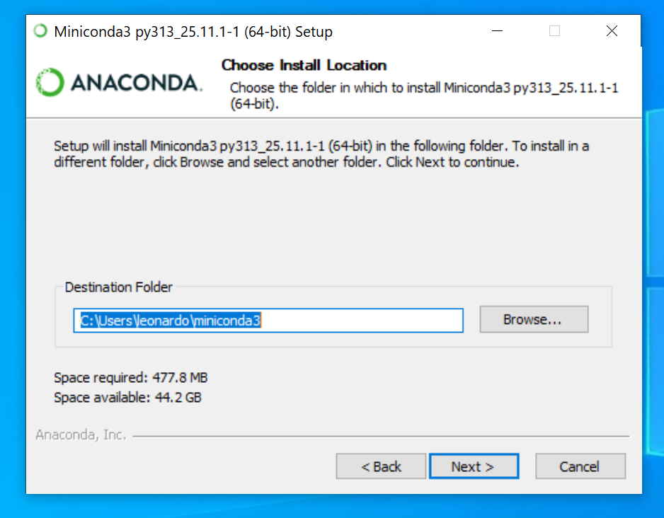- Once you downloaded the installer, start it and go through the first welcoming steps. Accept the license and chhose whether you want to install Conda just for you or all the users in the PC. The choice here is not relevant, so pick what suits you best;